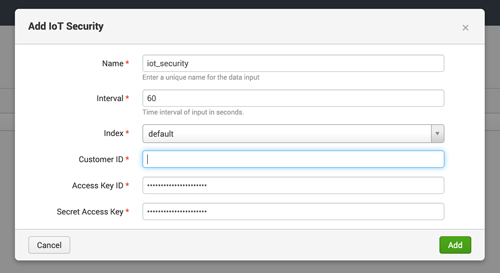 Within the Add-on, click the Input tab at the top left. Then click Create New Input and select IoT Security.